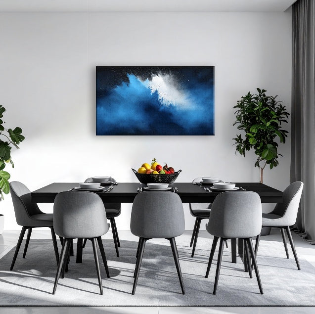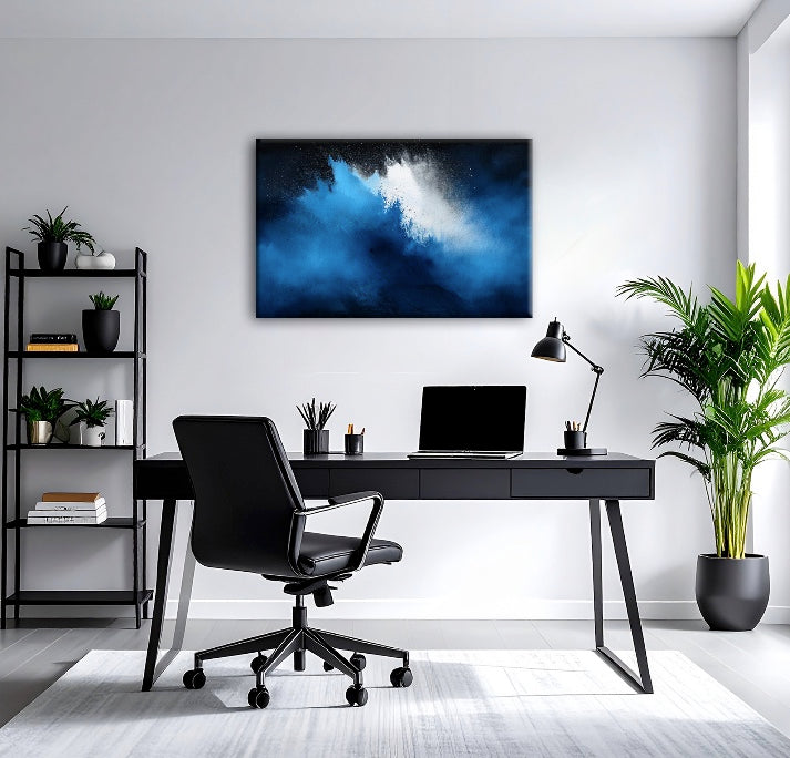 Verleihen Sie Ihrem Raum eine Atmosphäre von zeitloser Eleganz und moderner Ausdruckskraft. Dieses abstrakte Kunstwerk in Blau, Weiß und Schwarz besticht durch seine kraftvolle Dynamik und seine harmonischen Kontraste.