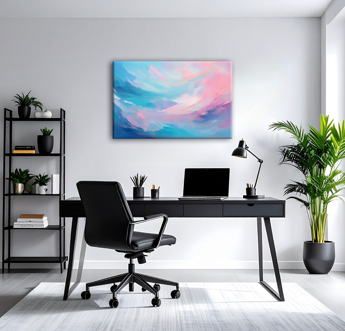 Himmelszauber vereint sanfte Blautöne mit zarten Rosé- und Lilanuancen. Das Bild erinnert an einen farbenreichen Abendhimmel und schafft eine beruhigende, zugleich inspirierende Atmosphäre.