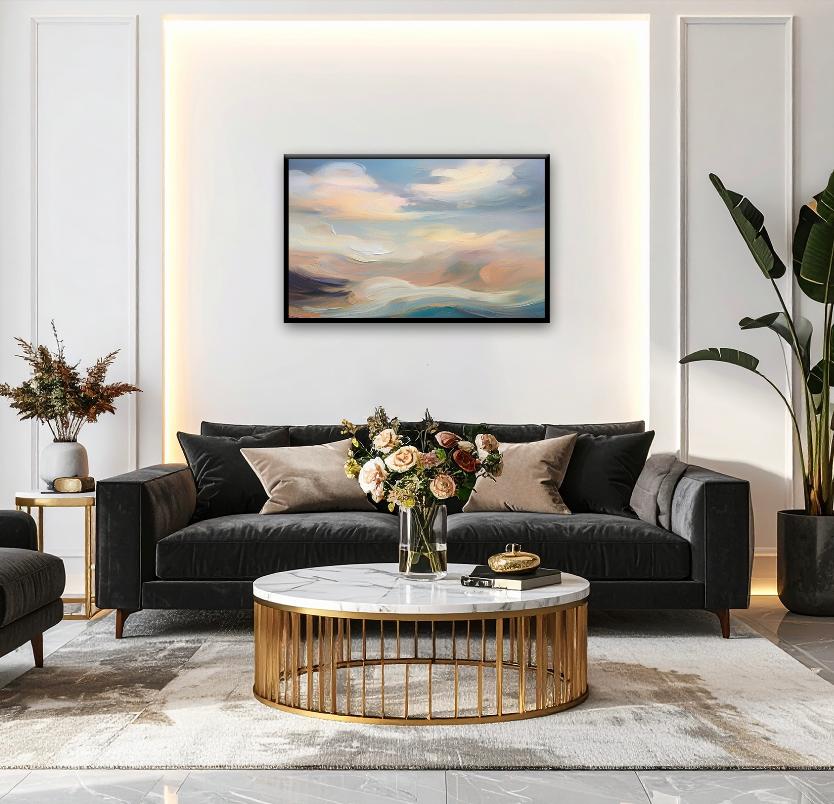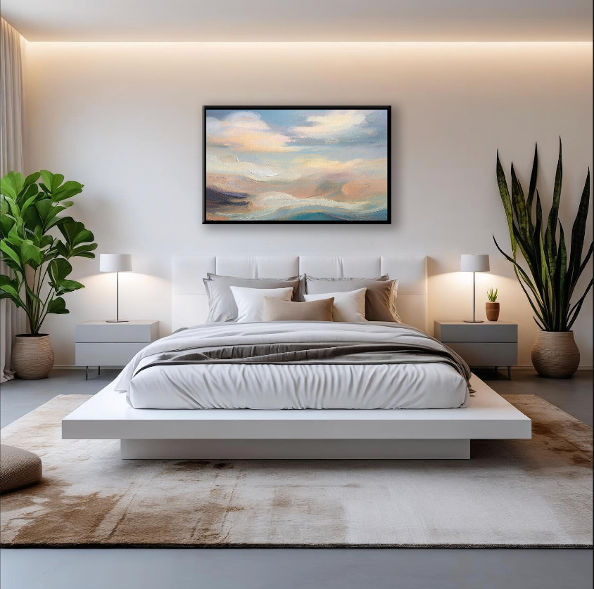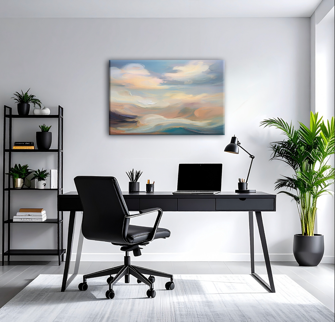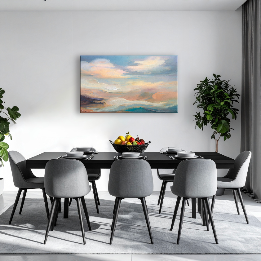 Abendhimmel fängt die Leichtigkeit von Wolken und Wellen in sanften Pastelltönen ein. Fließende Strukturen in Blau, Beige, Rosé und Creme erzeugen eine beruhigende, träumerische Stimmung.
