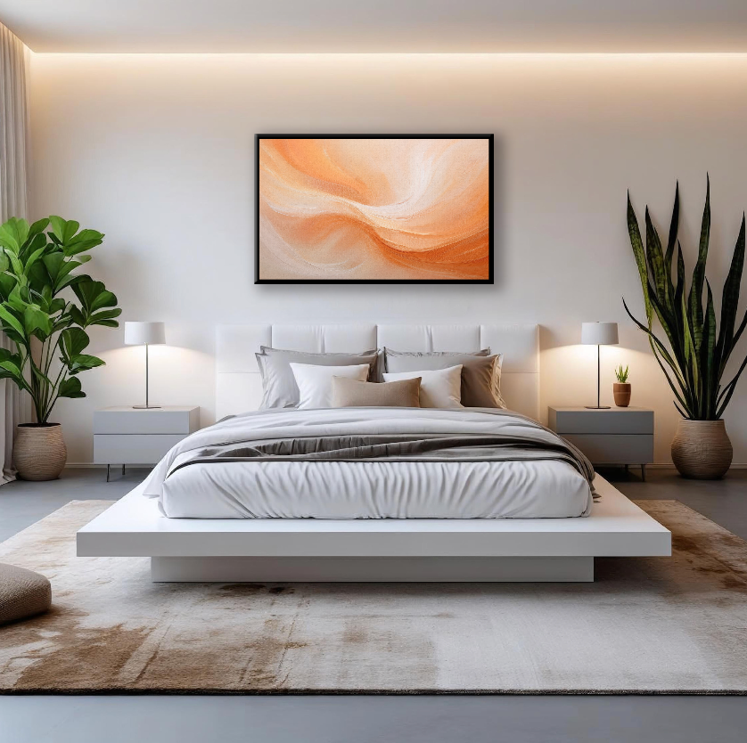 Pfirsichhauch besticht durch sanfte Apricot- und Weißtöne, die in fließenden Bewegungen ineinander übergehen. Das Bild strahlt Leichtigkeit und Wärme aus und verleiht jedem Raum eine freundliche, harmonische Atmosphäre.