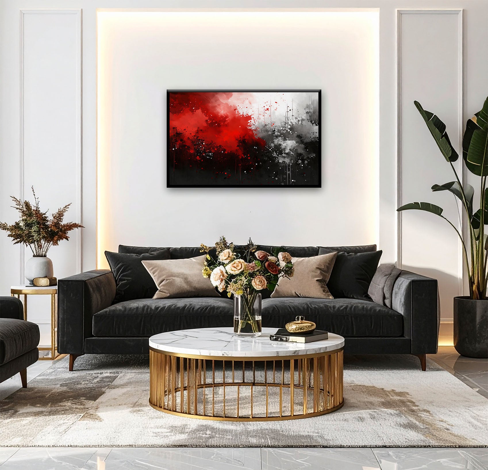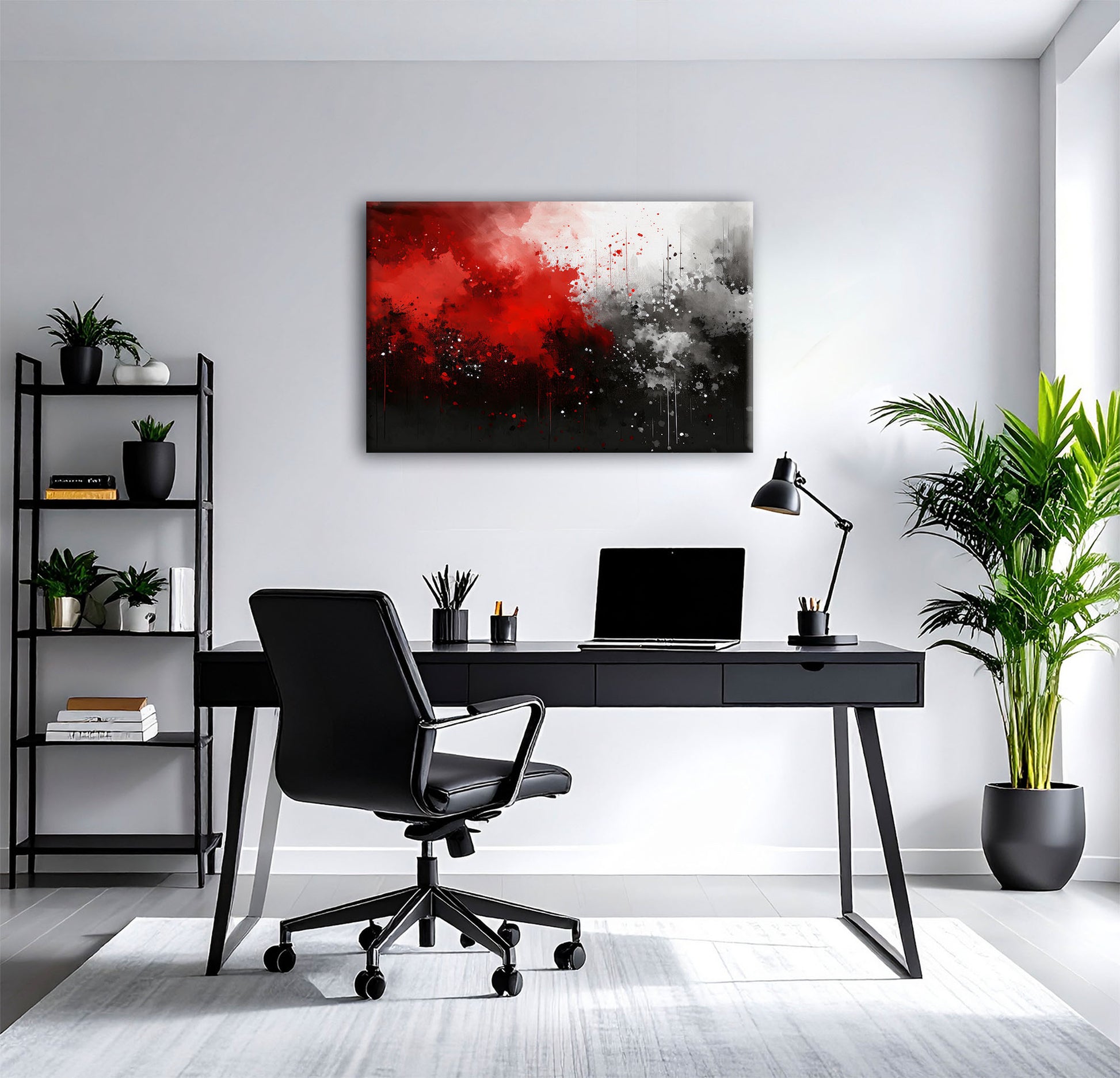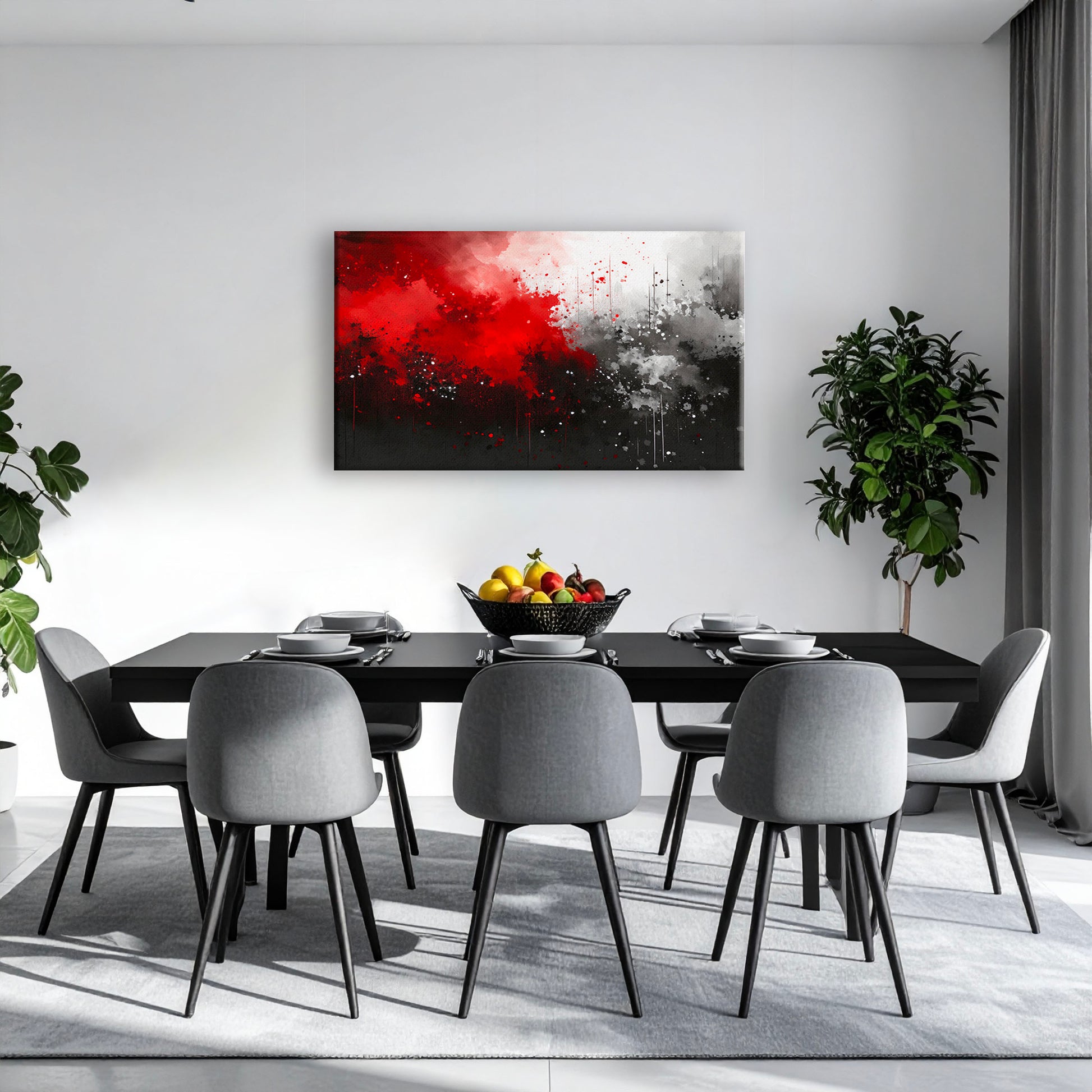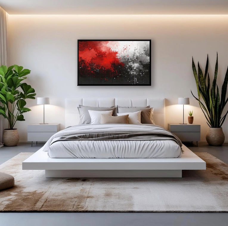 Verleihen Sie Ihrem Raum eine Atmosphäre von zeitloser Eleganz und moderner Ausdruckskraft. Dieses abstrakte Kunstwerk in Rot, Schwarz und Grautönen besticht durch seine kraftvolle Dynamik und seine harmonischen Kontraste.